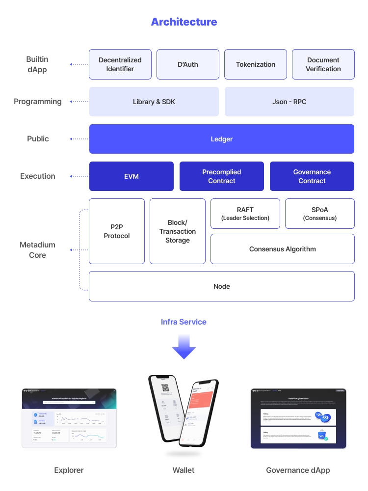 The Metadium blockchain operates through peer-to-peer (P2P) communication among distributed nodes, utilizing a leader election based on the Raft Consensus Algorithm and a consensus algorithm based on Staked-based Proof of Authority (SPoA). Since it runs on the Ethereum Virtual Machine (EVM), developers familiar with Ethereum can easily learn and use it. The Metadium blockchain supports developers in reading and writing Metadium's information from the public ledger through various libraries, SDKs, and Json-RPC. Additionally, it provides dApps for Tokenization, Decentralized Identifier, Document Verification, and D'Auth, allowing developers to develop these functionalities. Moreover, it offers an Explorer for easy blockchain information verification, a Wallet for convenient asset transfer, and Governance dApps for making policy decisions on the blockchain.
